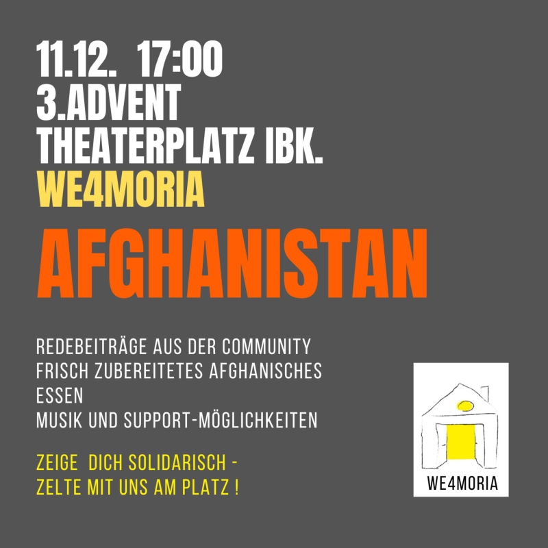 WIR SIND ZURÜCK Nach kurzer Pause sind wir am 17.12. ab 14:00 Uhr bis 18.12. vormittags wieder vor dem Landestheater in Innsbruck zu finden! Wir wollen gemeinsam auf die unverändert beschämende und grausame EU-Grenzpolitik aufmerksam machen und fordern einen menschenrechtswürdigen Umgang mit Geflüchteten. Dabei werden wir nicht darum herumkommen, auch über die Situation und Geschehnisse in Tirol zu sprechen - Stichwort "Zimmer statt Zelte". Davon abgesehen gibt es leider immer noch...